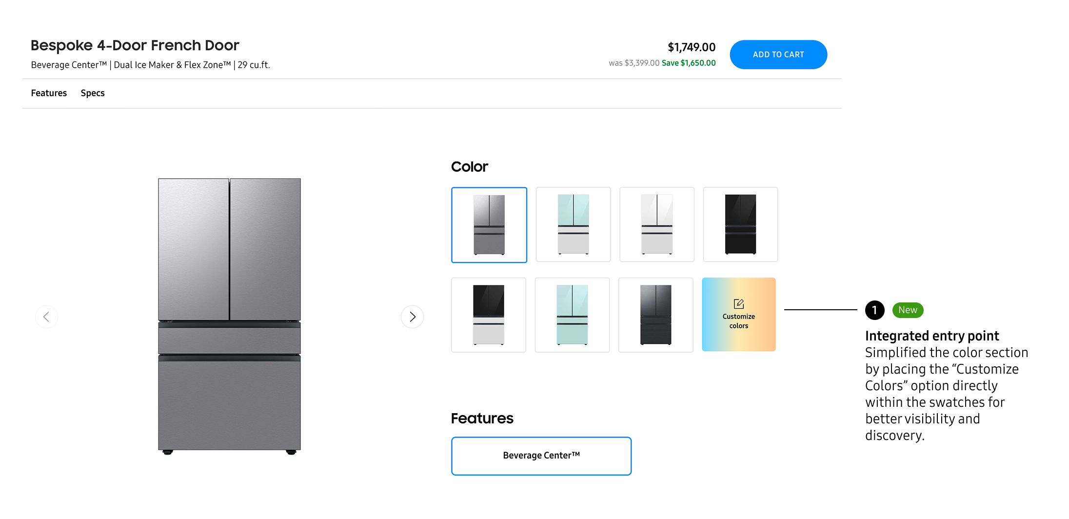 The main design goals centered around creating a premium, user-friendly experience that reflects the brand’s commitment to quality and innovation. Each component of the page was re-evaluated to improve usability, hierarchy, and interaction flow. Guided by user research, the team focused on understanding key customer priorities and behaviors when landing on a product page to design a more intuitive and conversion-driven experience.